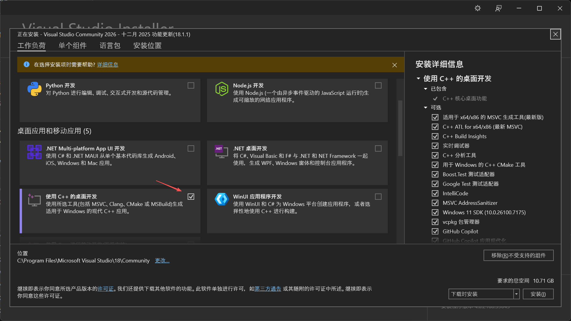 勾选并安装“使用 C++ 的桌面开发”组件。